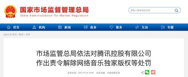 据国家市场监管总局24日消息,2021年1月,市场监管总局根据举报,对腾讯控股有限公司2016年7月收购中国音乐集团股权涉嫌违法实施经营者集中行为立案调查。