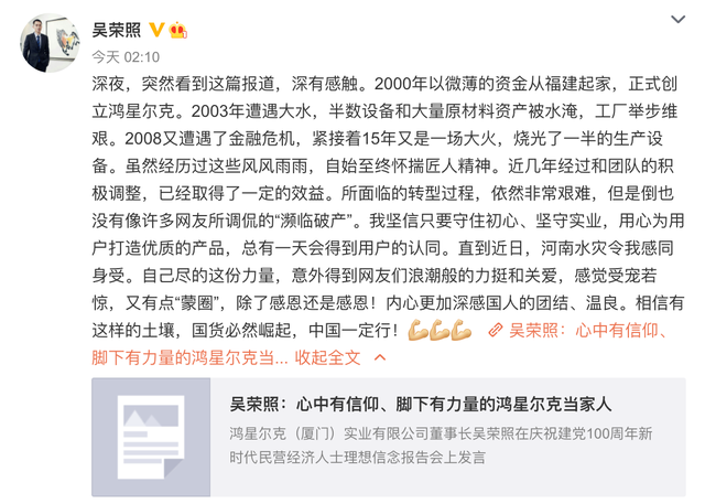 吴荣照说,坚信只要守住初心、坚守实业,用心为用户打造优质的产品,总有一天会得到用户的认同。直到近日,河南水灾令我感同身受。自己尽的这份力量,意外得到网友们浪潮般的力挺和关爱,感觉受宠若惊,又有点“蒙圈”,除了感恩还是感恩!内心更加深感国人的团结、温良。相信有这样的土壤,国货必然崛起,中国一定行!